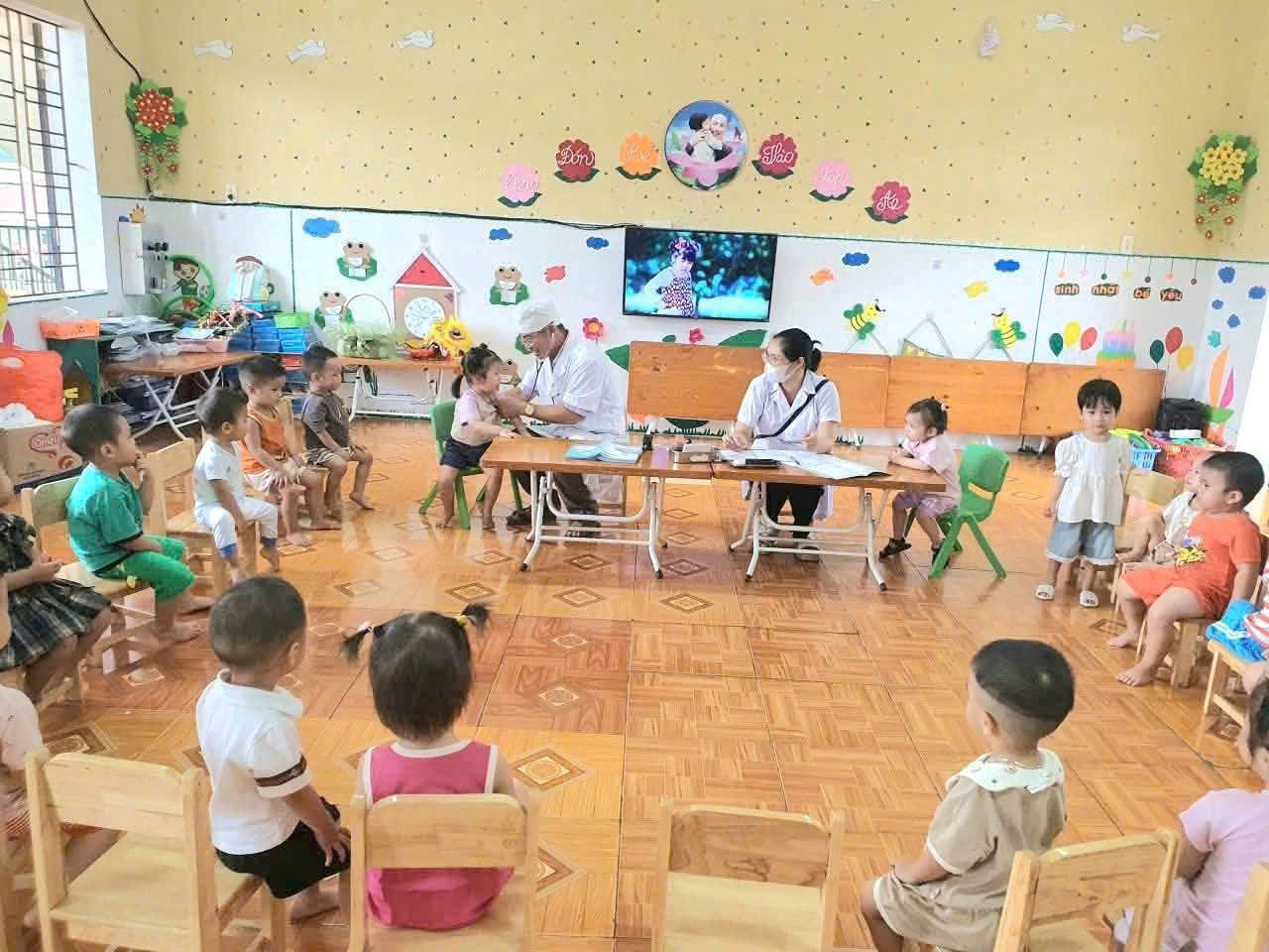 Các bác sĩ Trạm Y tế Điệp Nông khám sức khỏe cho trẻ em tại trường Mầm non Điệp Nông