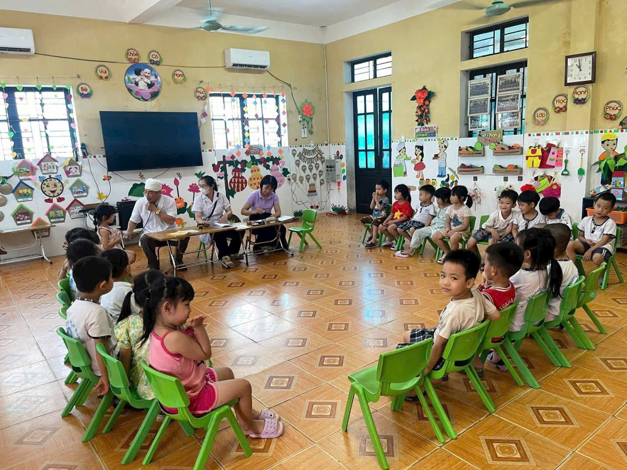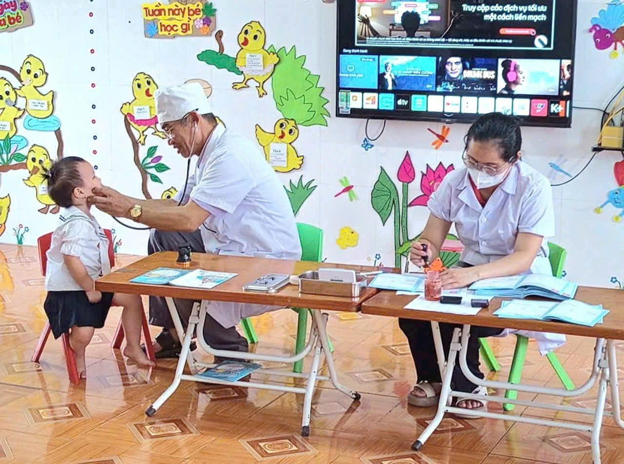 Các bác sĩ Trạm Y tế Diên Hà khám sức khỏe cho trẻ em tại trường Mầm non Duyên Hải