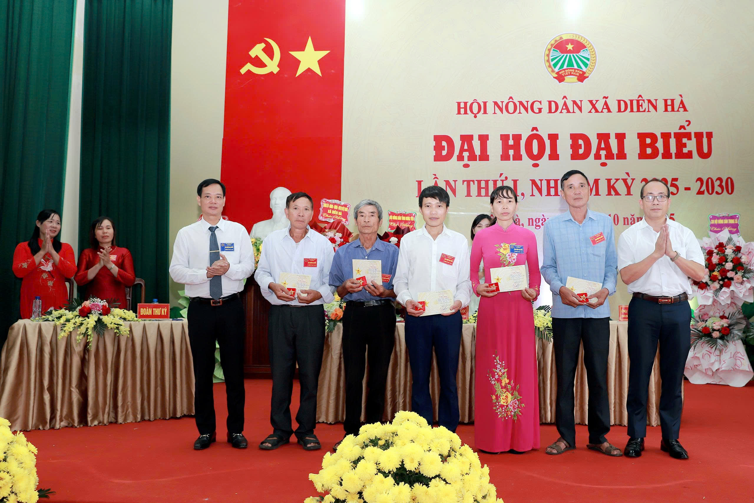 Đ/c Phạm Thanh Bình, uỷ viên Ban thường vụ Hội Nông dân tỉnh, Phó trưởng Ban công tác nông dân tỉnh; Đ/c: Nguyễn Thái Dương, Bí thư Đảng uỷ, Chủ tịch HĐND xã trao Kỷ niệm trương cho cán bộ Hội