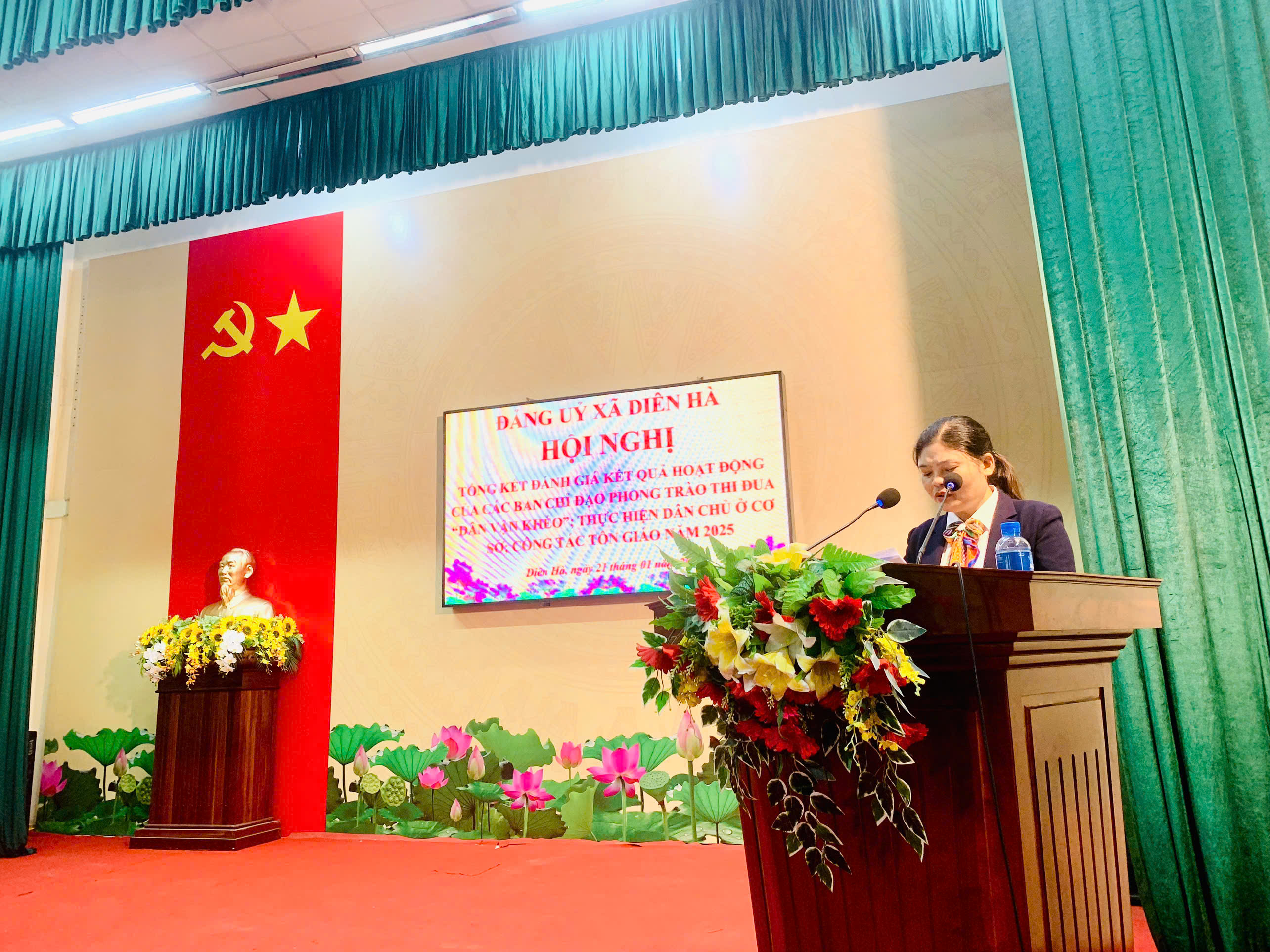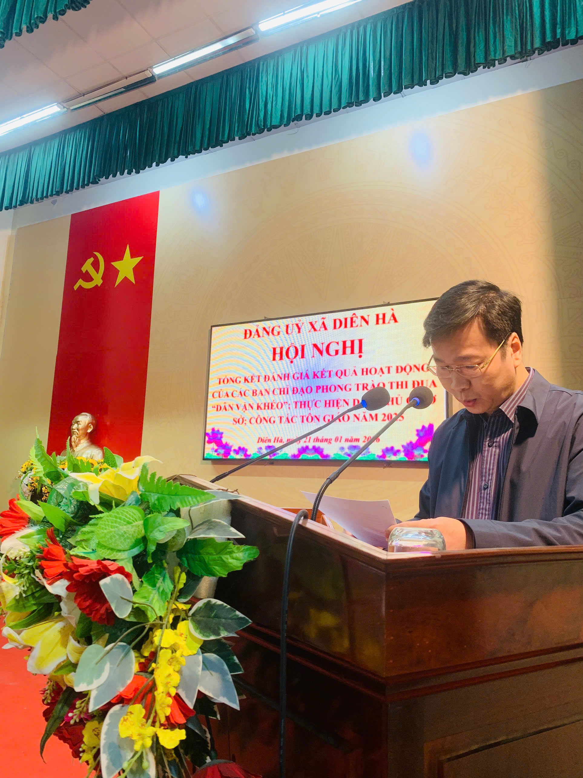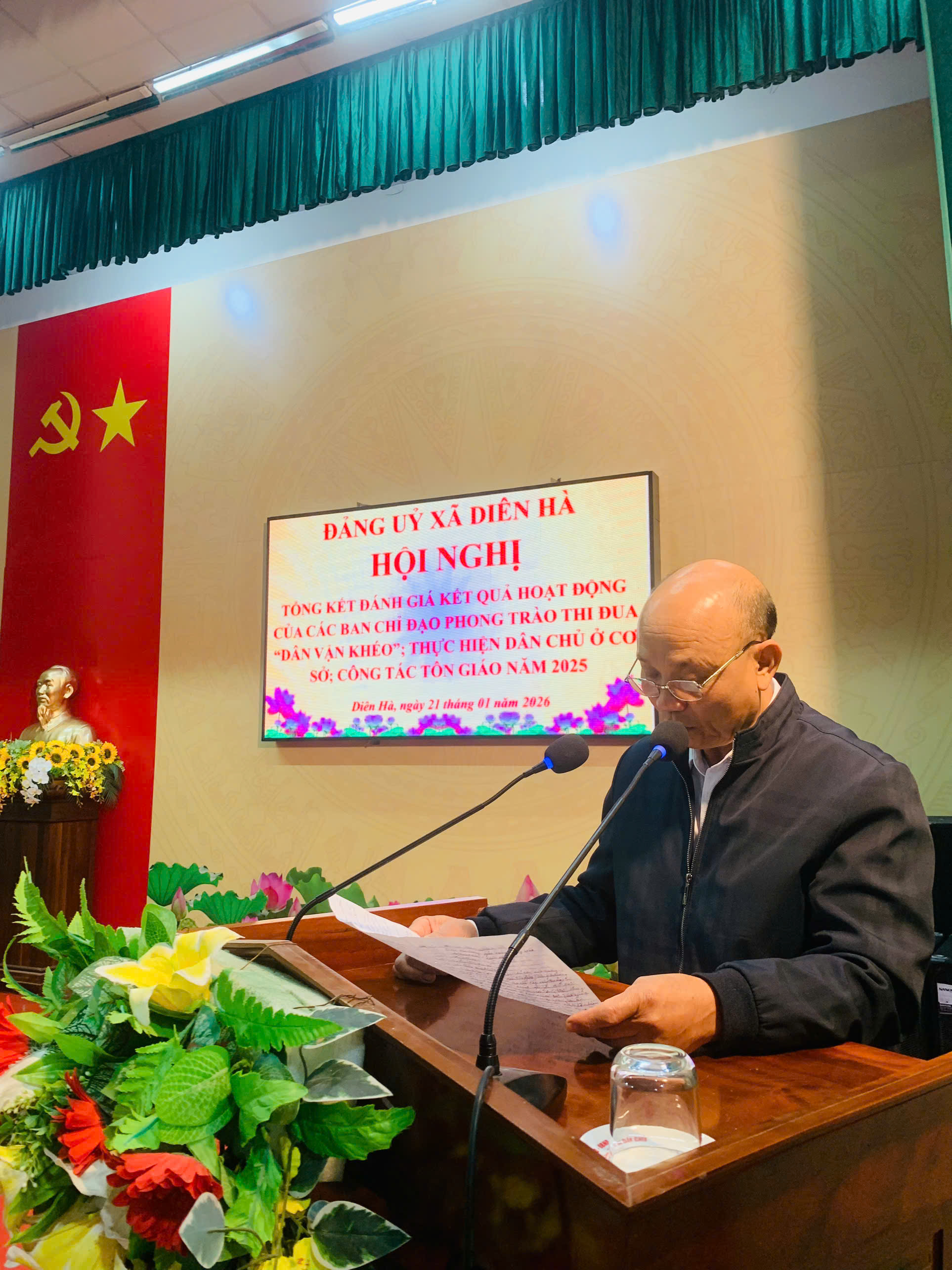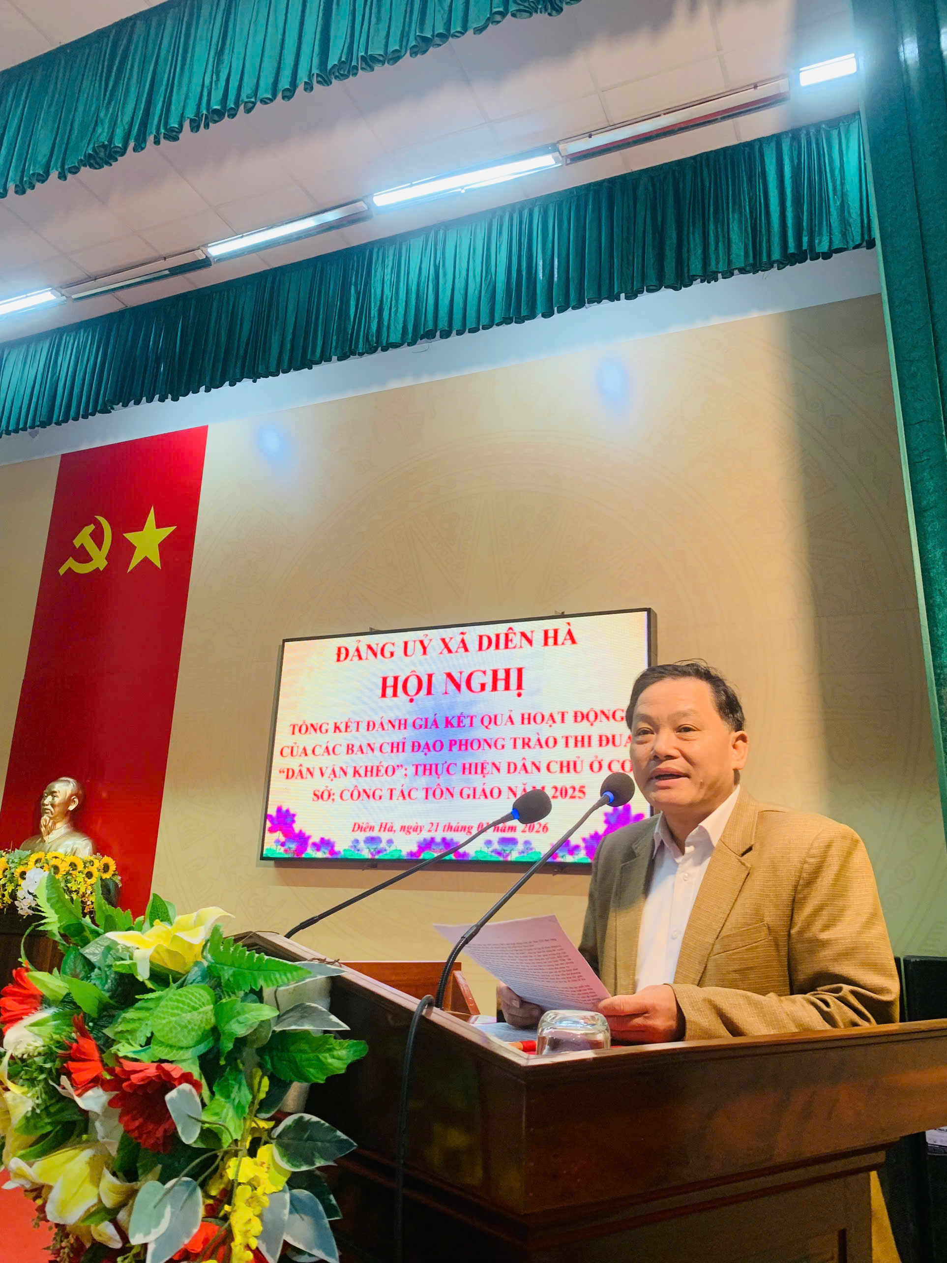 Sáng ngày 21/01/2026, tại Hội trường trụ sở Đảng ủy xã, Đảng ủy xã Diên Hà tổ chức Hội nghị tổng kết hoạt động các Ban Chỉ đạo thực hiện dân chủ ở cơ sở, phong trào thi đua “Dân vận khéo”, công tác tôn giáo năm 2025; triển khai nhiệm vụ trọng tâm năm 2026 và gặp mặt chức sắc, chức việc, đảng viên là người có đạo trên địa bàn xã. Đến dự hội nghị có đồng chí Tạ Văn Bằng, Phó Trưởng phòng Dân vận các cơ quan nhà nước, Dân tộc và Tôn giáo, Ban Tuyên giáo và Dân vận Tỉnh ủy; đồng chí Nguyễn Thái Dương, Bí thư Đảng ủy, Chủ tịch HĐND xã; đồng chí Bùi Phú Hưng, Phó Bí thư Thường trực Đảng ủy; đồng chí Bùi Viết Tuấn, Phó Bí thư Đảng ủy, Chủ tịch UBND xã; cùng các đồng chí trong Ban Chấp hành Đảng bộ xã, lãnh đạo HĐND, UBND, Ủy ban MTTQ xã, đại diện các tổ chức chính trị – xã hội và đông đảo chức sắc, chức việc, đảng viên là người có đạo trên địa bàn.