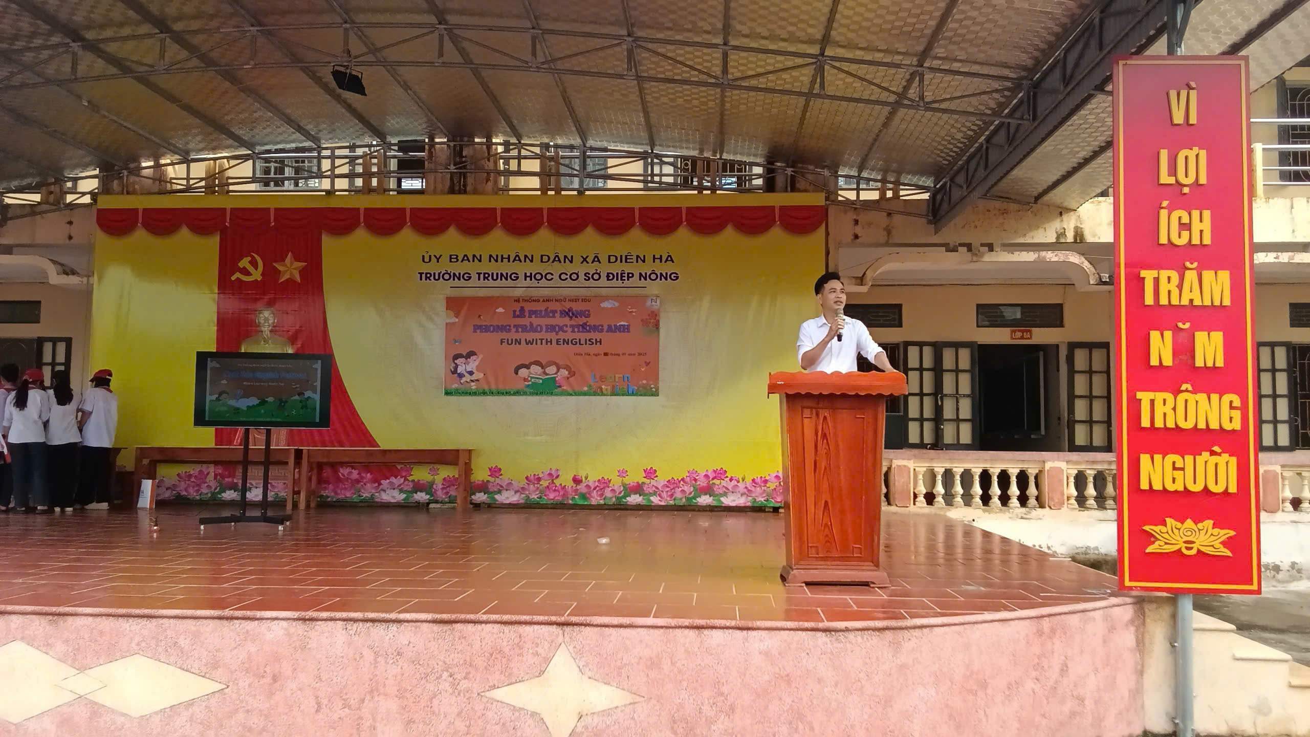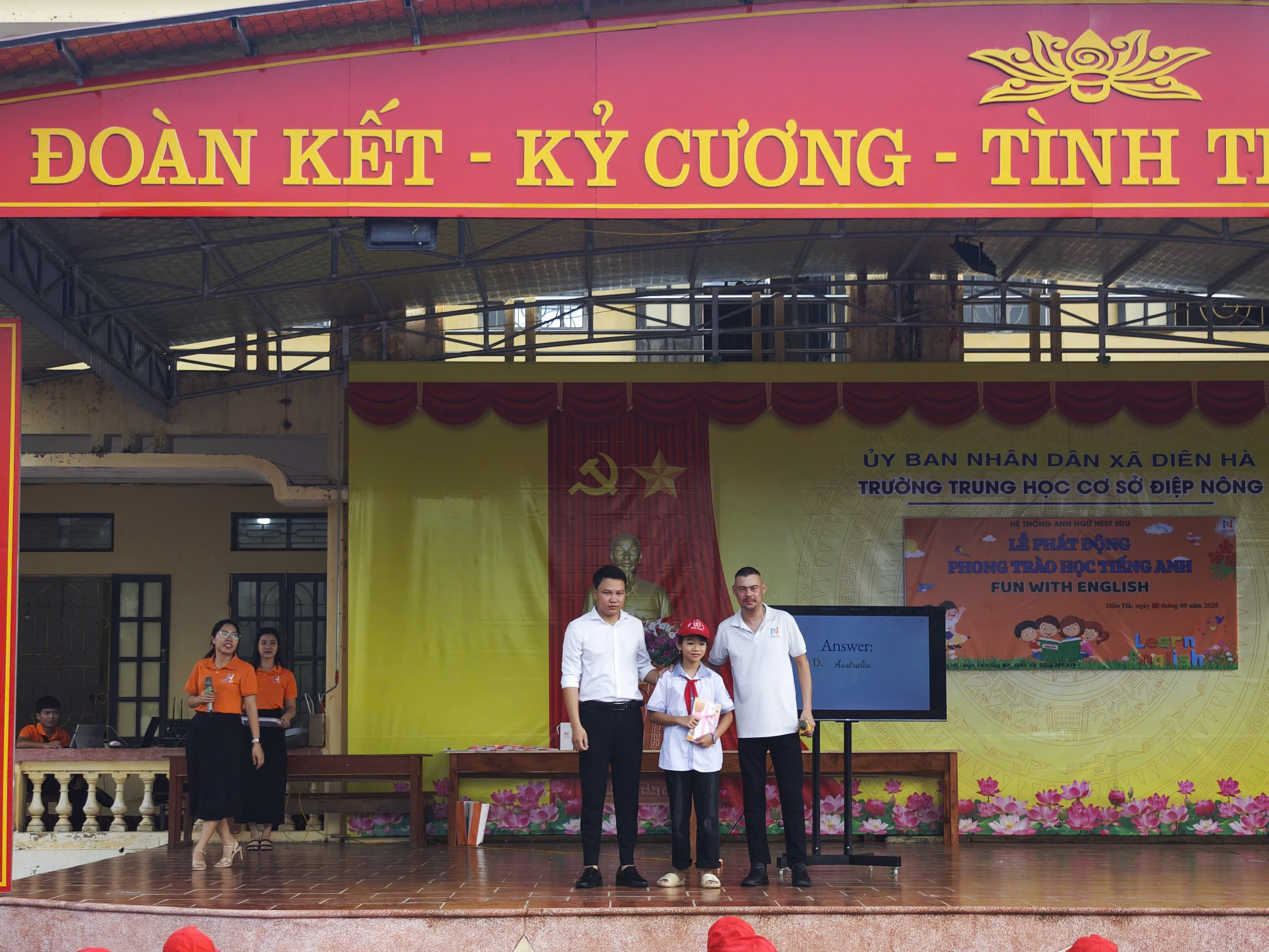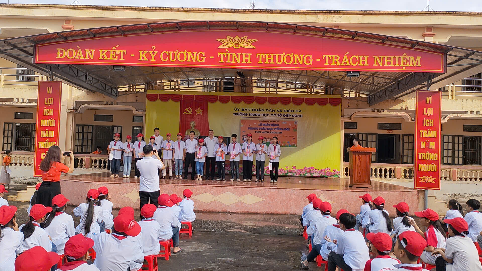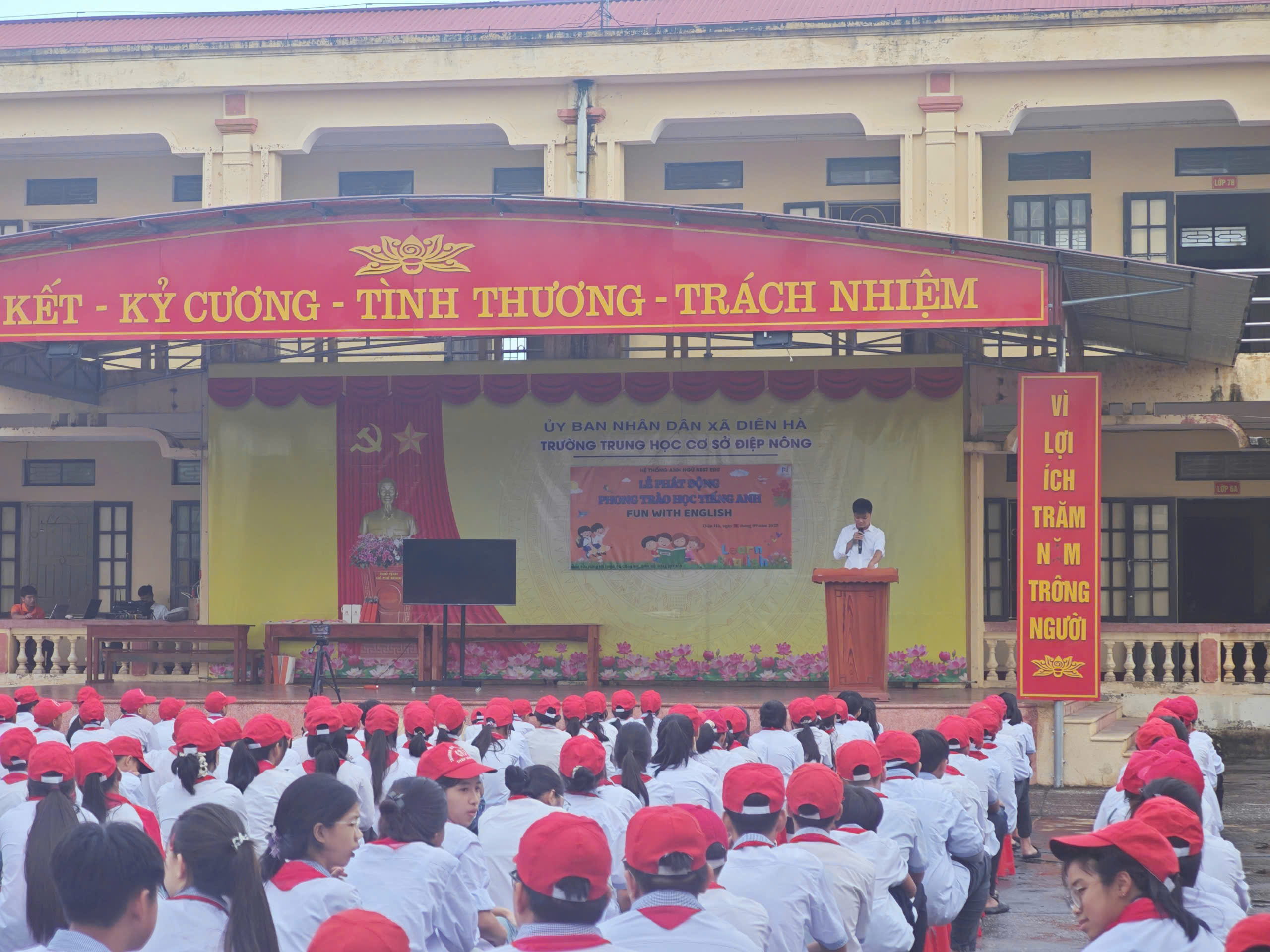 Thực hiện Nghị quyết số 71-NQ/T.Ư ngày 22/8/2025 của Bộ Chính trị về đột phá phát triển giáo dục và đào trong đó khẳng định “tăng cường việc dạy và học ngoại ngữ, từng bước đưa tiếng Anh trở thành ngôn ngữ thứ hai trong trường học”. Sáng ngày 18/9/2025, trường THCS Điệp Nông, xã Diên Hà phối hợp cùng Hệ thống Anh ngữ NEST EDU tổ chức Lễ phát động phong trào học tiếng Anh. Đây là hoạt động ý nghĩa, thiết thực nhằm khơi dậy niềm hứng thú và tinh thần rèn luyện ngoại ngữ cho học sinh trong toàn trường. Tham dự buổi lễ có các thầy cô trong Ban Giám hiệu nhà trường, quý đại biểu khách quý, cùng toàn thể cán bộ, giáo viên và học sinh trường THCS Điệp Nông.