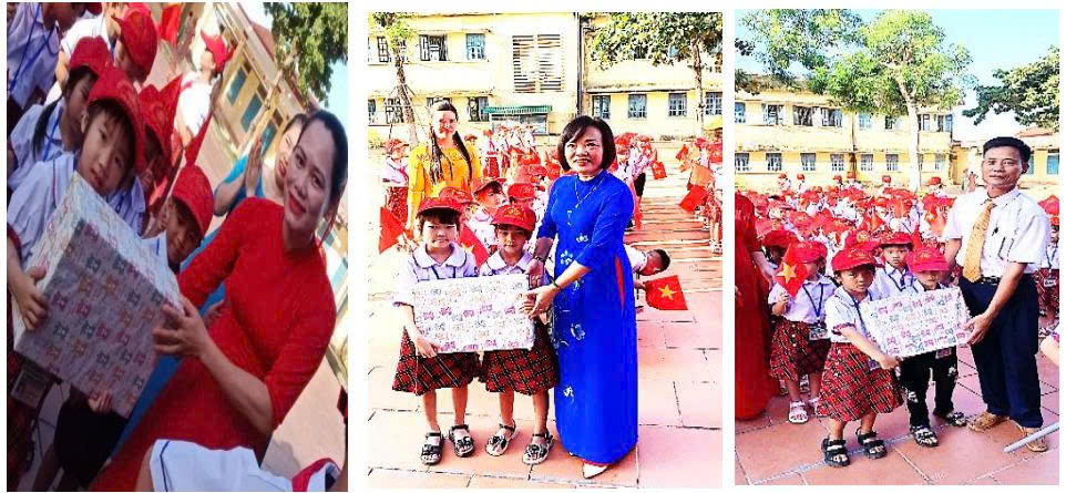 Lãnh đạo nhà trường và Tổng phụ trách tặng quà cho các em học sinh Lớp 1.