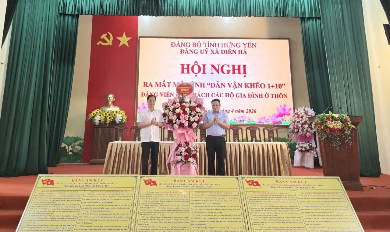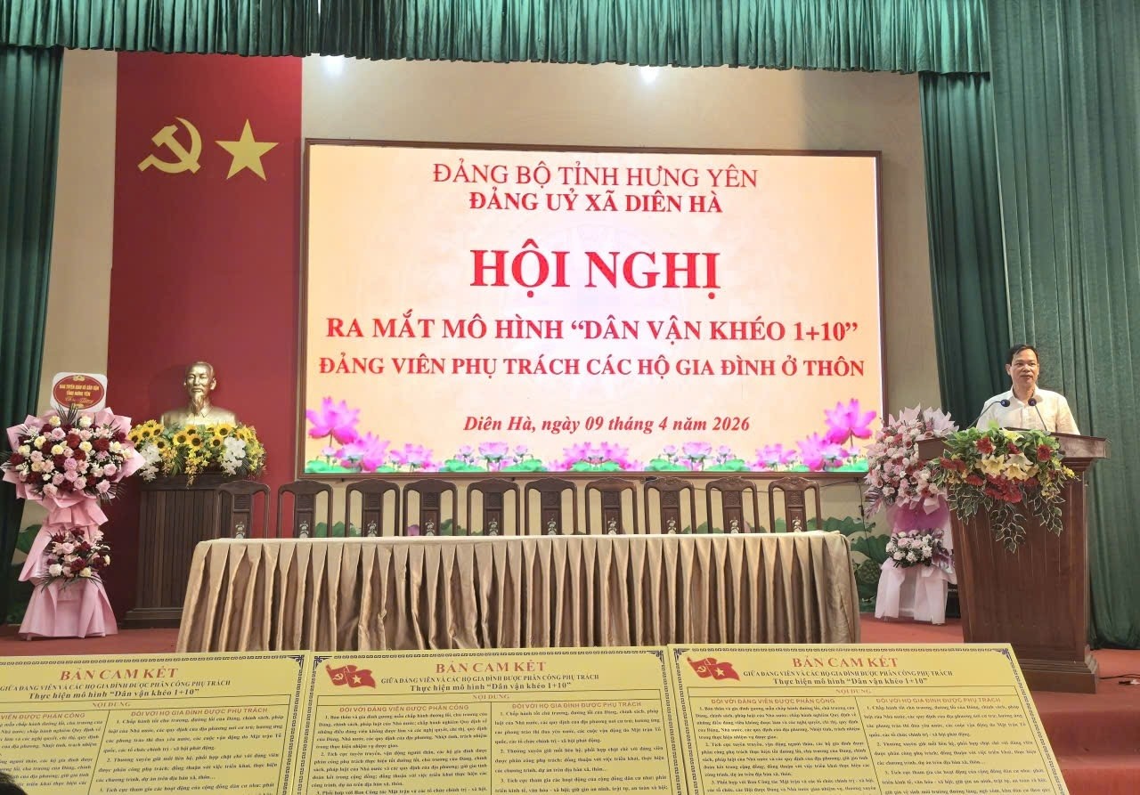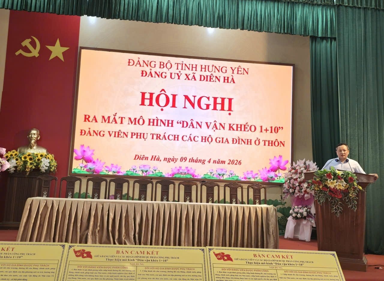 Chiều ngày 09/4/2026, tại Hội trường Đảng ủy xã Diên Hà, Ban Thường vụ Đảng ủy xã đã tổ chức Hội nghị ra mắt mô hình “Dân vận khéo 1+10” (một đảng viên phụ trách 10 hộ gia đình) giai đoạn 2025 – 2030 trên địa bàn xã.