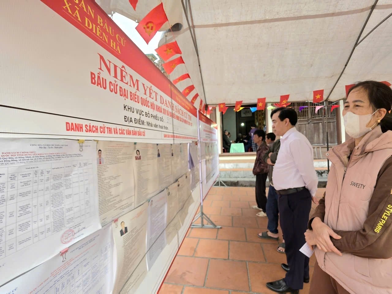 Các đồng chí lãnh đạo tỉnh và xã kiểm tra việc niêm yết danh sách cử tri và danh sách ứng cử viên tại khu vực bỏ phiếu.