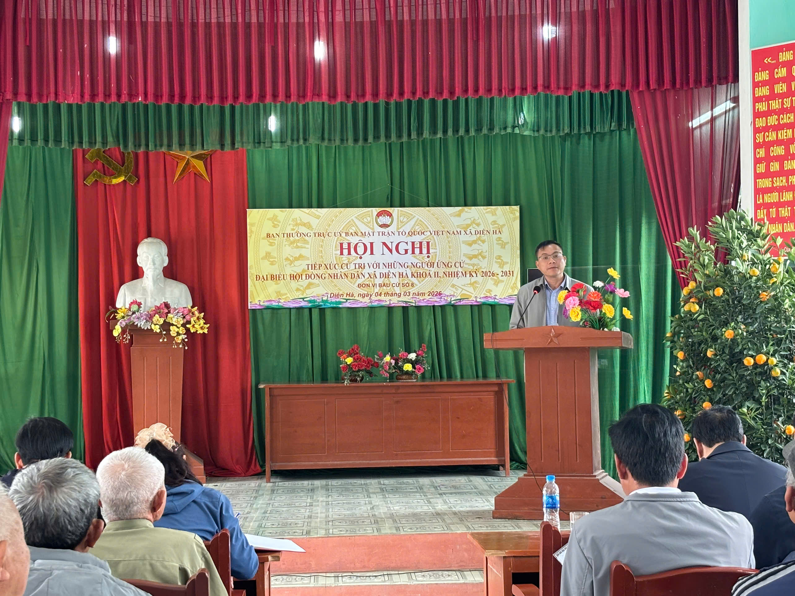 Thực hiện Luật Bầu cử đại biểu Quốc hội và đại biểu Hội đồng nhân dân năm 2015; Luật sửa đổi, bổ sung một số điều của Luật Bầu cử đại biểu Quốc hội và đại biểu Hội đồng nhân dân năm 2025, trong các ngày 04 và 05/3/2026, Ban Thường trực Ủy ban MTTQ Việt Nam xã Diên Hà đã phối hợp với UBND xã và các tổ chức chính trị – xã hội tổ chức các hội nghị tiếp xúc cử tri để người ứng cử đại biểu HĐND xã khóa II, nhiệm kỳ 2026 – 2031 vận động bầu cử tại các đơn vị bầu cử trên địa bàn xã.
